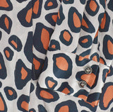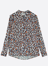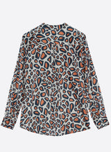 En klassisk silke skjorte med håndmalet girafprint i nedtonende rust og petroleums farver på en bund af dæmpet pudder. Skjorten er semi-fitted, har skjult knaplukning, brystlommer, kinakrave og ryglæg.