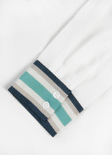 En off white skjorte med brystlommer, læg detalje på ryggen og skjult knaplukning. Blå, tyrkis og sandfarvede striber er digital printet på manchetten og giver et casual, men samtidig stilet look.