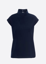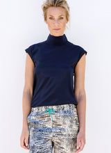 Eve er en japansk inspireret marineblå højhalset top i en blød ren silke crepe de chine med en anelse stretch. Eve toppen er lige skåret med en bred ærmeløs skulder, som skjuler det øverste af armen. Toppen har to knapper i nakken, som giver et flot finish.