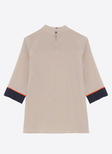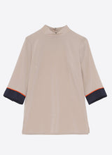 Lulu er en semi-fitted højhalset bluse med 3/4 lange ærmer, åben manchet og knaplukning i nakken.