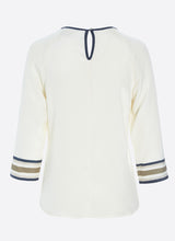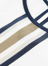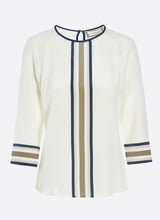 Maeve blusen er en elegant og grafisk silkebluse syet i tung 23mm silke crepe de chine med stræk - et absolut luksusmateriale, der føles meget meget behageligt at have på. De 3/4 lange raglanærmerne giver skuldrene en flatterende form og hals- og nakkelukning er afsluttet med et smukt mørkeblåt bånd som matcher de grafiske striber. Den elfenbensfarvede bund brydes af klassiske striber i navy, olivengrøn og sand.