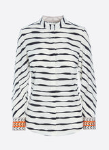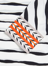Ink Stripe printet med grafiske manchetter i sandfarvet og orange er et af de aller første Mille Frydenberg prints. Det har været med os lige siden og blevet lavet i forskellige versioner og farvekombinationer. Vi er glade for at kunne re-lancere Ink Stripe printet som et Signatur print - og denne gang i en 22mm tyk silke crepe de chine
