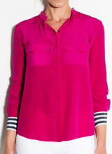 Klassiske skjorte med kinakrave, brystlommer og skjult knaplukning i en flot varm pink. Skjorten er detaljeret med Mille Frydenberg signatur zig-zag stribede detalje på manchetterne.