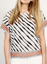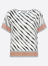 Silke tee syet i let 12 mm silke crepe de chine. Mønsteret er vores håndmalede Ink Stripe print kombineret med grafiske border og orange kontrastdetalje.